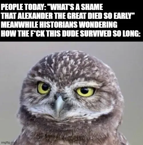 PugJesus@piefed.socialMEnglish · 18 hours ago"Okay fam, I'm gonna charge headlong with my cavalry into the enemy lines like I'm some junior officer instead of the literal monarch, you got my back, right?" media.piefed.socialimagemessage-square2linkfedilinkarrow-up176arrow-down10