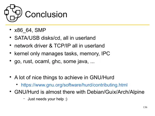 Samuel Thibault offered up a status update on the current state of GNU/Hurd from a presentation in Brussels at FOSDEM 2026. Thibault has previously shared updates on GNU Hurd from the annual FOSDEM event while this year’s was a bit more optimistic thanks to recent driver progress and more software now successfully building for Hurd.