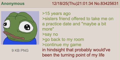 But from anon’s perspective - being anon - he is in the same position, only worse. After all, for some reason he can’t possibly understand, a girl went on a date with him and blew him, practically handed herself to him on a silver platter, and yet he still managed to fuck it up and didn’t lose his virginity. What a hopeless loser he is (he thinks to himself) - even if he is just given the perfect chance, he must be so repulsive and terrible at sex that no woman will want to touch him once they get close enough.