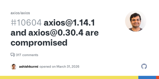 axios@1.14.1 and axios@0.30.4 are compromised · Issue #10604 · axios/axios