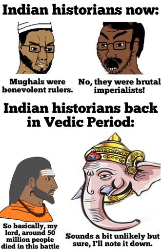Context: Modern historians debate and argue over historical events. Meanwhile the sage Vyasa dictating the Mahabharata to Lord Ganesha, showing that ancient historians simply recorded massive, made-up casualty counts - something shared across the globe.