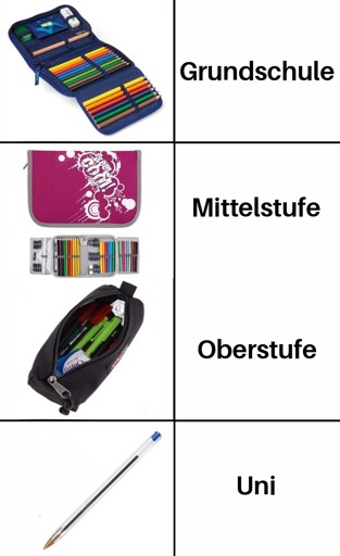 dies ist der Weg. Bei mir ab Abi Tasche auch nur als alibi dann “hassumazettelunstift”, dann wiederum alibi mäßig irgendwas kritzeln und am Ende direkt Papierkorb. Respektlosigkeit hat leider von da an immer weniger Spaß gemacht. Erwachsenwerden so dumm