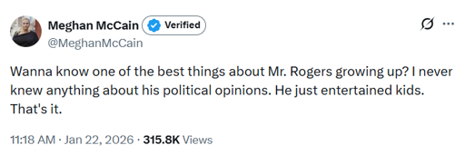 What’s funny is that she’s right. He wasn’t political. He was just a normal decent person. He didn’t talk about Republicans (which I believe he himself was) or Democrats. So in that sense, yeah, he wasn’t political.