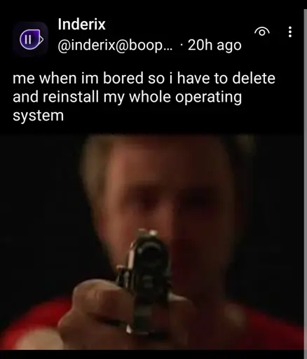 not_IO@lemmy.blahaj.zone to Microblog Memes@lemmy.worldEnglish · 10 days agoit feels cleanerlemmy.blahaj.zoneimagemessage-square30linkfedilinkarrow-up1285arrow-down110file-text