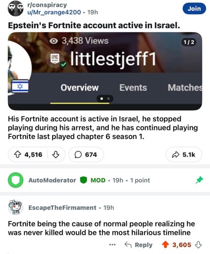 The fortnite account shows it was active like 2 months after his “death” but way before the files were released. Like 10 months before the files were released. Also there was a prison guard on 4chan (he got identified and was working at the prison) who claimed of an off the books transport van that showed up the evening before his death and it was kept out of the log books. Also that bit of footage the night of his death at the prison that showed just the tiniest bit of an orange jumpsuit going towards Epsteins cell. And all the cameras that just strategically managed to not be working.