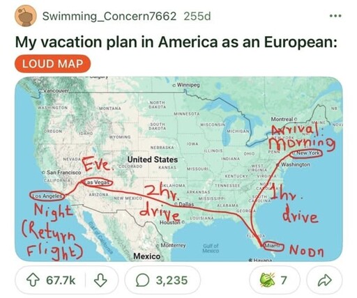 Sure, “TIL Europe is only seven countries.” Try the same but go Amsterdam -> Riga -> Athens -> Lisbon -> Amsterdam it’s 8000 km in a straight line. Europe might be smaller than North America, but it’s not that small.