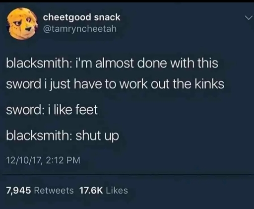 Blacksmith : “I’m almost done with this sword, I just have to work out the kinks.”