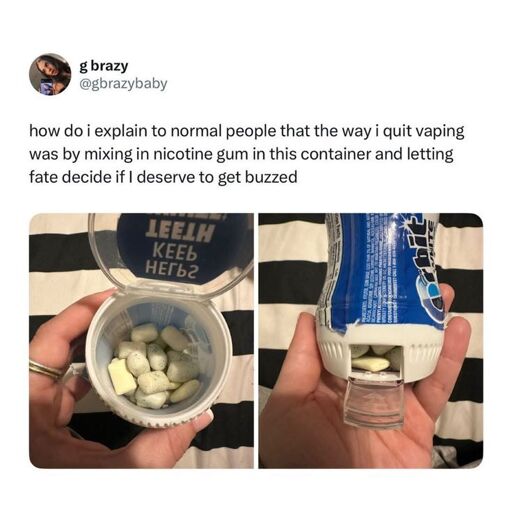 minus-squareALoafOfBread@lemmy.mllinkfedilinkarrow-up1·2 hours agoOh yeah for sure. Just make sure it isn’t sorbitol or you’d spend the same time on the toilet that cigarettes would shorten your life by