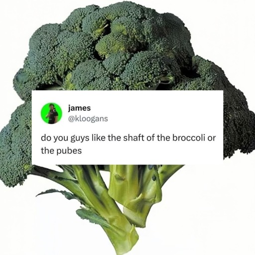 Ew I don’t understand pube eaters at all (with regards only to broccoli, I don’t always mind a nice bush). The broccoli florets or whatever are so dry and end up tasting bitter and just taking forever to eat. I only like the shaft but the shaft is probably better than cucumber in terms of a nice crispy veggie that you can just bite into and chew raw. Raw broccoli florets are inedible unless you have like a liter of ranch which kinda defeats the purpose.
