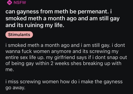If meth, which is a stimulant, makes you gay. Then heroin, which is a depressant, should make you straight again. A speedball will make you bi since it contains both stimulants and depressants, or it could turn you trans so that the gay from the stimulant will become straight from the depressant.