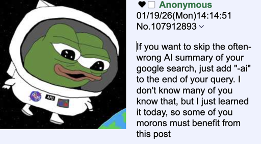 minus-squaremycodesucks@lemmy.worldlinkfedilinkarrow-up0·1 month agoDefinitely. Just getting rid of the ai summary still leaves you with Google’s search results, which are SEO manipulated crap.
