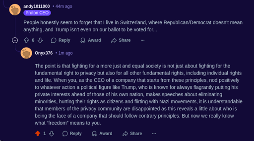 Onyx376@lemmy.ml to Privacy@lemmy.ml · edit-21 year agoFlirting with Trump is flirting with Nazism - Response to Andy Yen (CEO of Proton AG) on Reddit 📢📢📢lemmy.mlimagemessage-square5linkfedilinkarrow-up10arrow-down10file-text