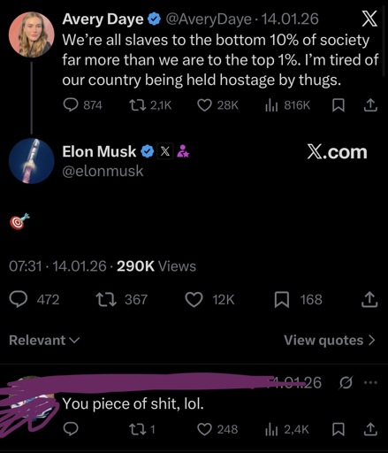 https://x.com/elonmusk/status/2011325253549769039 or https://xcancel.com/elonmusk/status/2011325253549769039