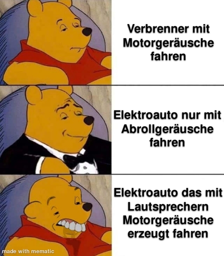 Also hast du deine Meinung zu dem Thema nicht geändert, da das Thema nicht “Künstliche Präsenzgeräusche für E-Autos” ist, sondern “Künstliche Motorgeräusche um Dieseldieter abzuholen”.