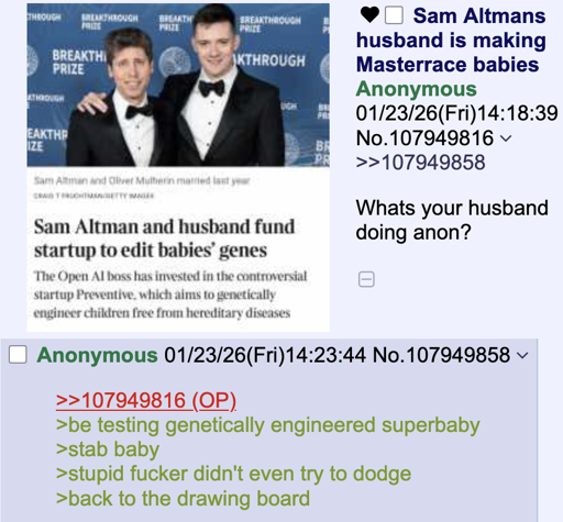Based on Altman’s comments the masterrace children will be “raised” by chat GPT. This trainwreck will be fun to watch
