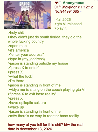 arrow-up15arrow-down1imageAnon plays GTA VIlemmy.worldkali_fornication@lemmy.world to Greentext@sh.itjust.works · 17 days agomessage-square3linkfedilink