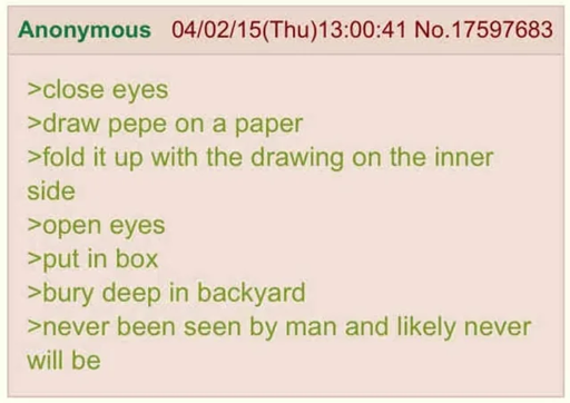 arrow-up15arrow-down1imageAnon creates the rarest pepesh.itjust.works🍹Early to RISA 🧉@sh.itjust.worksM to Greentext@sh.itjust.works · 25 days agomessage-square18linkfedilink