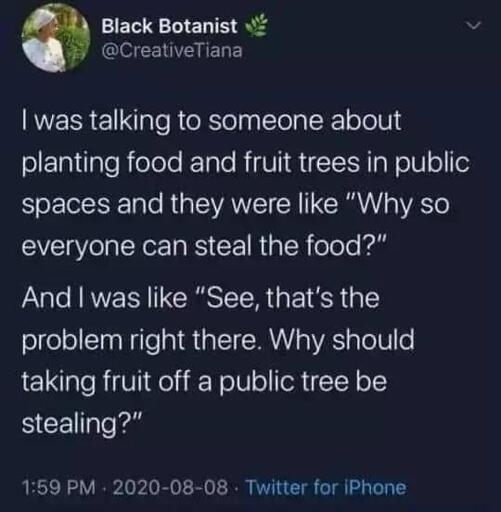And it is not the reason we don’t plant fruit trees in cities. The reason we don’t plant fruit trees in cities is theyre messy as fuck.