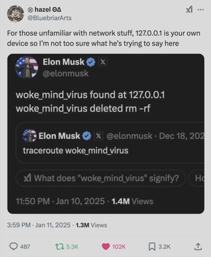 HiddenLayer555@lemmy.ml to Programmer Humor@programming.devEnglish · 1 year agoIt's a Unix system! Elon knows this!lemmy.mlimagemessage-square6linkfedilinkarrow-up10arrow-down10