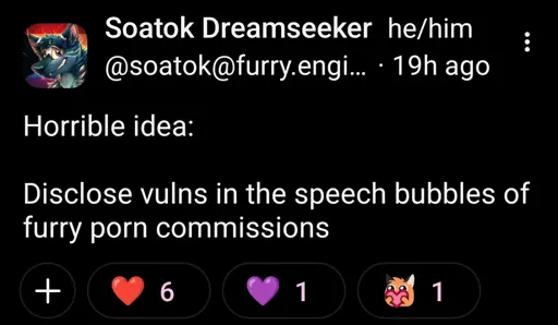 minus-squarePlatypus@sh.itjust.workslinkfedilinkEnglisharrow-up19·13 days agoVulnerabilities. I think this is in reference to the flood of AI slop “vulnerability fixes” spamming projects to farm bug bounties—if the vulnerabilities are disclosed in furry porn, security engineers are guaranteed to see them but bots might not.