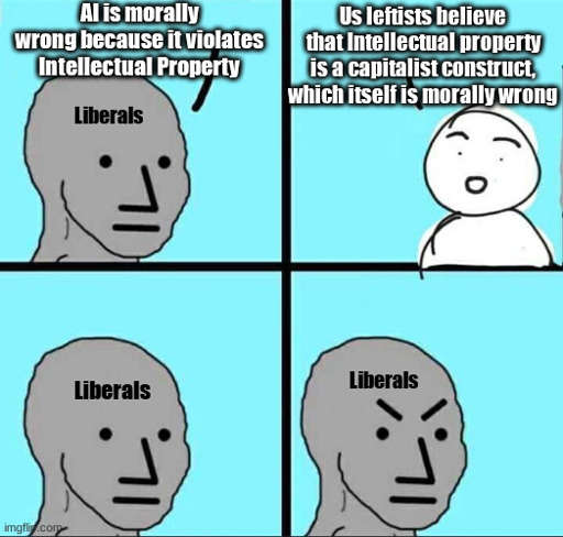 Yeah, exactly! That’s what I’m trying to say in response to OP talking about “liberals” defending intellectual property, which I took to mean copyright in that case.