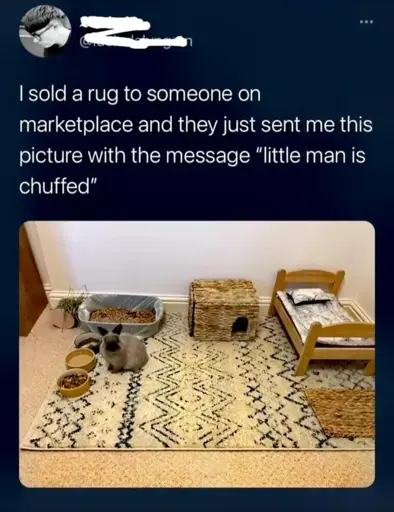 My wife’s rabbit (from before we were married) used to nudge me to stack his blocks. When I started, he’d trot in a circle around the living room. When I had finished, he’d go from stack to stack knocking them over. We’d do that a bunch. When was bored of that, he’d lay down near me and require me to rub him. He had things going the way he liked them. He absolutely would have been excited to have a rug and a whole area devoted to him and his stuff.