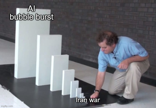 I’m sorry, but it really bugs me that the small domino is a fucking war. While the big domino is depicted here as the AI bubble bursting.