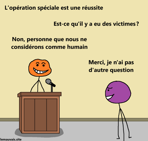 [orange, au sourire arrogant, derrière un pupitre, parle dans un micro] L’opération spéciale est une réussite