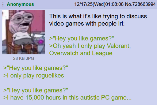 arrow-up1733arrow-down1imageAnon wants to talk about video gamessh.itjust.works🍹Early to RISA 🧉@sh.itjust.worksM to Greentext@sh.itjust.works · 6 days agomessage-square237linkfedilink