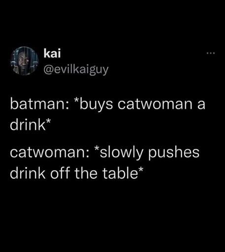 minus-squareAneb@lemmy.worldlinkfedilinkEnglisharrow-up1·8 days agoIf Catwoman wanted a drink then Selina would steal her own drink