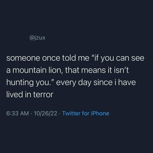 minus-squareOtter@lemmy.calinkfedilinkarrow-up5·2 days agoI saw a mountain lion in the closet, which means it’s not hunting me. Who else is hiding in the room…