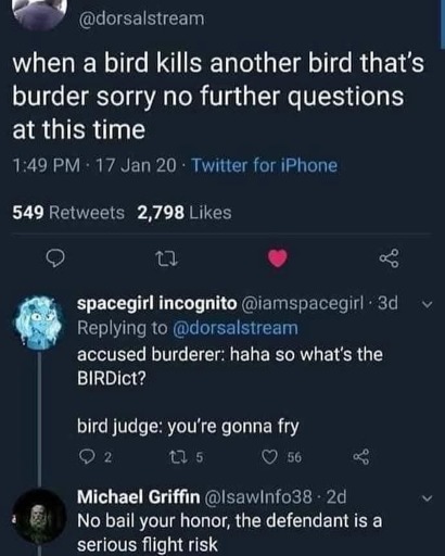 MTZ@lemmy.world to Lemmy Shitpost@lemmy.world · 14 days agoBird Lawlemmy.worldimagemessage-square15linkfedilinkarrow-up1529arrow-down13
