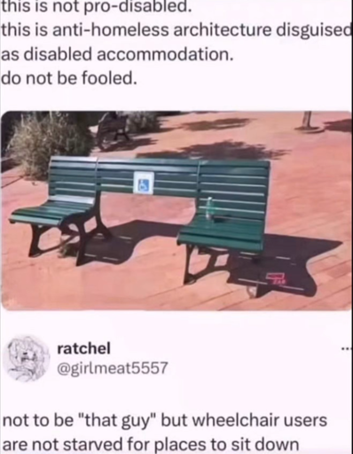 Lies! Anti-homeless this may be, but this bench was also created with the VERY noble intention of facilitating wheelchair-bound men to receive a handjob from two women at once!