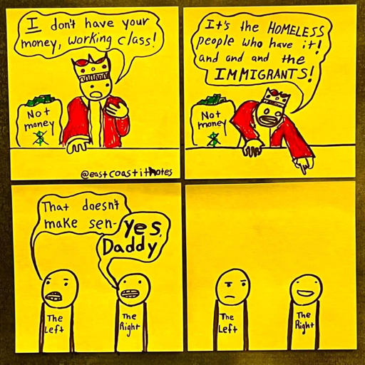 Yeah, I understand what you’re saying, and you’re right that authoritarian leftists are a big threat, as we saw with the USSR and China, but I gotta say, it feels quite unhelpful to say that both sides are being played - it’s quite a defeatist position and discourages people from moving away from the right, centrism and liberalism, towards more leftist positions. Social democrats/democratic socialists are a problem too, but they have no traction, whereas the far-right has a lot of traction. We need to meet people where they are and help them reach the next step on the ladder of class consciousness. I don’t know about you, but I didn’t go from being conservative to anarchist overnight, it was a long and painful journey.