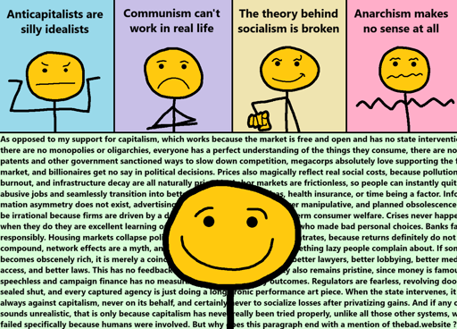 As opposed to my support for capitalism, which works because the market is free and open and has no state intervention, there are no monopolies or oligarchies, everyone has a perfect understanding of the things they consume, there are no patents and other government sanctioned ways to slow down competition, megacorps absolutely love supporting the free market, and billionaires get no say in political decisions. Prices also magically reflect real social costs, because pollution, burnout, and infrastructure decay are all naturally priced in. Labor markets are frictionless, so people can instantly quit abusive jobs and seamlessly transition into better ones without rent, visas, health insurance, or time being a factor. Infor mation asymmetry does not exist, advertising is purely informative and never manipulative, and planned obsolescence would be irrational because firms are driven by a deep moral commitment to long-term consumer welfare. Crises never happen, but when they do they are excellent learning opportunities that only affect those who made bad personal choices. Banks fail responsibly. Housing markets collapse politely. Of course, capital never concentrates, because returns definitely do not compound, network effects are a myth, and first-mover advantage is just something lazy people complain about. If someone becomes obscenely rich, it is merely a coincidence that they can now afford better lawyers, better lobbying, better media access, and better laws. This has no feedback effect whatsoever. Democracy also remains pristine, since money is famously speechless and campaign finance has no measurable impact on policy outcomes. Regulators are fearless, revolving doors are sealed shut, and every captured agency is just doing a long, ironic performance art piece. When the state intervenes, it is always against capitalism, never on its behalf, and certainly never to socialize losses after privatizing gains. And if any of this sounds unrealistic, that is only because capitalism has never really been tried properly, unlike all those other systems, which failed specifically because humans were involved. But why does this paragraph end with a mention of thebad.website ?