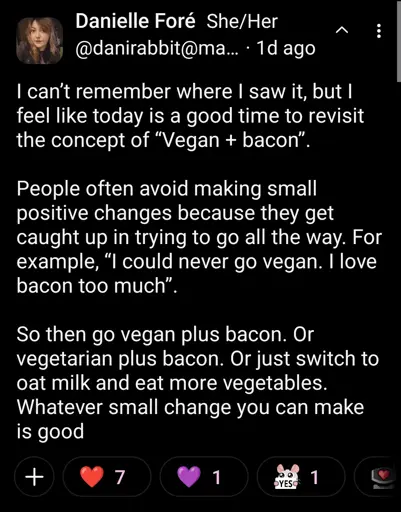 I don’t eat much meat because I know that morally it’s the correct choice, but personally I don’t care for the animals that died when I do eat meat. I’m completely aware that their murder is fueling my tastebuds, and I don’t hide it. I don’t think I’ll ever go full vegan unless the food offering changes, because I personally don’t care enough for the animals. I’d say that rn I’m 90% vegetarian, meaning that I probably eat meat only once a week.