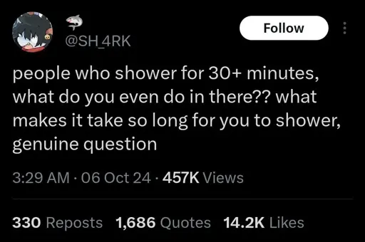 Stamets@lemmy.dbzer0.com to People Twitter@sh.itjust.works · 3 months agoI can undress, shower, dry and dress in less than 10. WHAT ARE YOU DOINGlemmy.dbzer0.comimagemessage-square3linkfedilinkarrow-up10arrow-down10