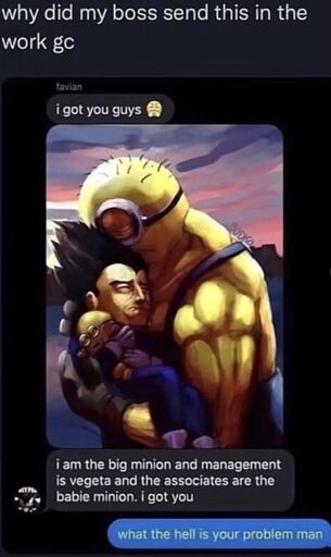 Lemmy Shitpost@lemmy.world•Does your boss even love you if he doesn't portray himself as the big minion and you as a baby minion?